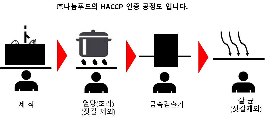 HACCP의 공정에 맞게 철저하게 관리하고 있으며, 금속검출기를 전수 확인하여