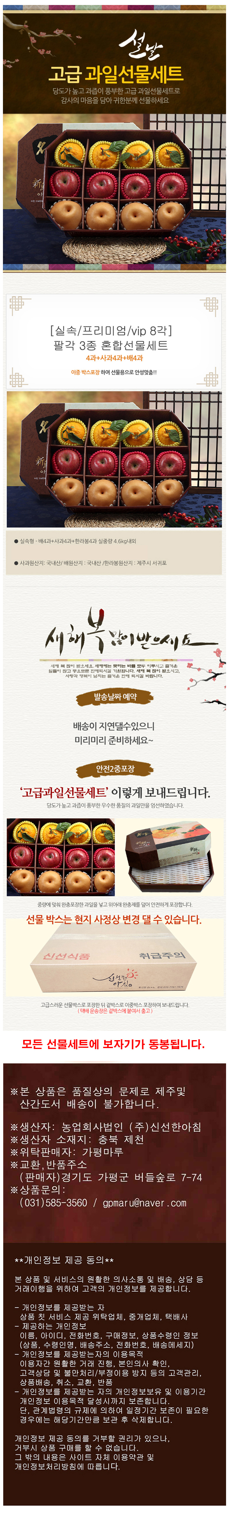 자연지기 팔각 실속과일3종 (4.6kg 배4+사과4+한라봉4) (보자기)
