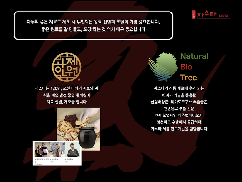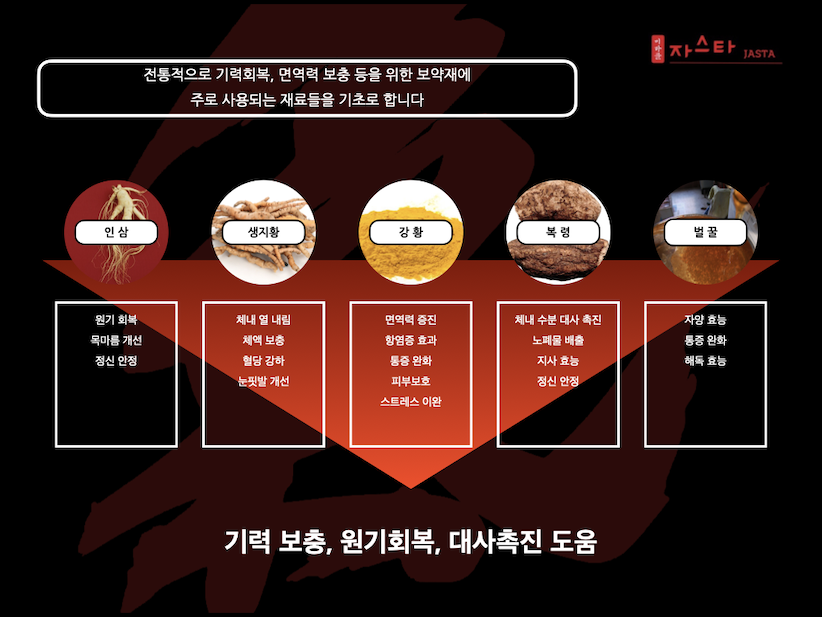 전통적으로 원가회복에 사용된 인삼, 복령, 생지황, 강황, 벌꿀에 산삼배양근 추출액, 항산화의 왕으로 불리는 아스타잔틴을 첨가하여,